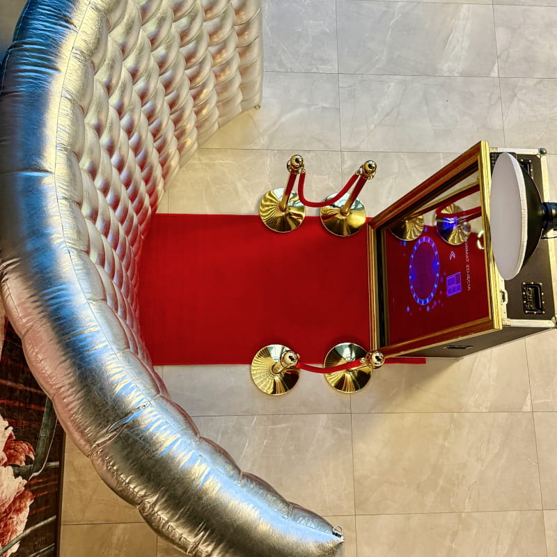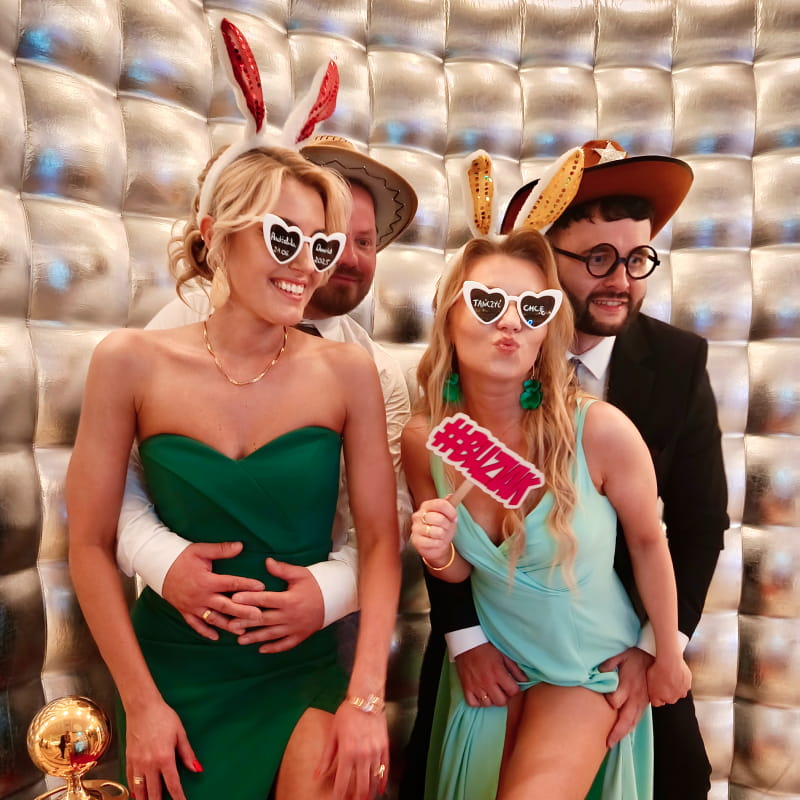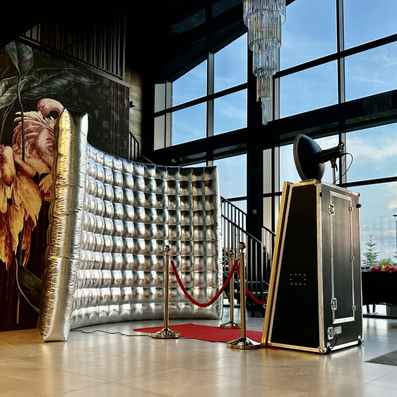 Wizualną oprawę fotobudki 360 wzbogaca do wyboru srebrna, różowa lub złota ścianka VIP.
